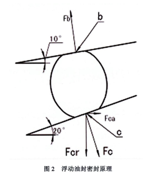 浮封環(huán)需成對使用,一個隨旋轉(zhuǎn)件旋轉(zhuǎn)(動環(huán)),另一個相對靜止(定環(huán)),在動環(huán)與浮封座之間以及在定環(huán)與浮封座之間的錐面處,各裝入一個具有圓形斷面的橡膠圈,在裝配預緊力作用下橡膠圈在浮封座形成的密封腔內(nèi)受軸向壓縮產(chǎn)生變形。產(chǎn)生垂直于浮封座錐面的彈力 Fb 和垂直浮封環(huán)錐面的彈力 Fc,彈力 Fc 分解為軸向分力 Fca 和徑向分力 Fcr。彈力 Fb 是橡膠圈與浮封座錐面緊密接觸實現(xiàn) b 處密封,彈力 Fc 是橡膠圈與浮封環(huán)錐面緊密接觸實現(xiàn) c 處密封,軸向分力 Fca 使兩浮封環(huán)密封面緊密接觸,實現(xiàn) a 處密封,最終實現(xiàn)整個密封系統(tǒng)的 5 處密封要求(見圖 2)。